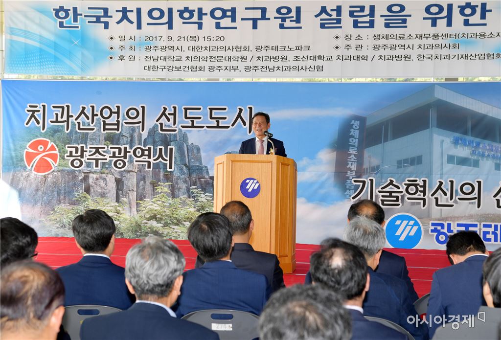 [아시아경제 노해섭 기자]윤장현 광주광역시장이 21일 오후 북구 테크노파크 2단지에서 열린 '치과용 소재 부품기술지원센터' 개소식에 참석해 인사말을 하고 있다.