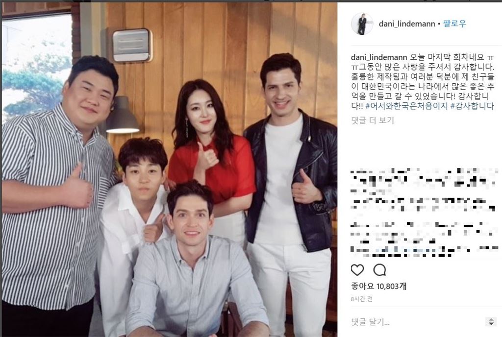 [아시아경제 고정호 기자]‘어서와 한국은 처음이지’(이하 ‘어서와’)에 출연한 다니엘 린데만이 마지막 회차를 앞두고 자신의 SNS를 통해 소감을 밝혔다.21일 다니엘은 자신의 인스타그램에 한 장의 사진과 글을 올렸다. 다니엘이 올린 사진에는 다니엘이 ‘어서와’ 출연진인 희극인 김준현, 가수 딘딘, 방송인 신아영, 알베르토 몬티와 함께 카메라를 바라보며 포즈를 취하고 있다.다니엘은 함께 올린 글에서 “오늘 마지막 회차네요ㅠㅠ 그동안 많은 사랑을 주셔서 감사합니다”라며 “훌륭한 제작팀과 여러분 덕분에 제 친구들이 대한민국이라는 나라에서 많은 좋은 추억을 만들고 갈 수 있었습니다! 감사합니다!!”고 적었다.이를 본 누리꾼들은 “덕분에 재밌게 시청했습니다. 독일 친구들 편 마지막이라니 넘 아쉽네요ㅠㅠ”(@j.gyo****), “다니엘 친구분들 다 젠틀맨 같아요”(@eorin_****), “정말 잼나게 봤어요~ 한국에 대해 좋은 인상 만들어줘서 감사합니다”(@jaewonjoohwanwoojin****) 등의 반응을 보이고 있다.한편 MBC에브리원 ‘어서와 한국은 처음이지?’는 매주 목요일 오후 8시30분 방송된다.고정호 기자 jhkho2840@asiae.co.kr<ⓒ세계를 보는 창 경제를 보는 눈, 아시아경제(www.asiae.co.kr) 무단전재 배포금지>