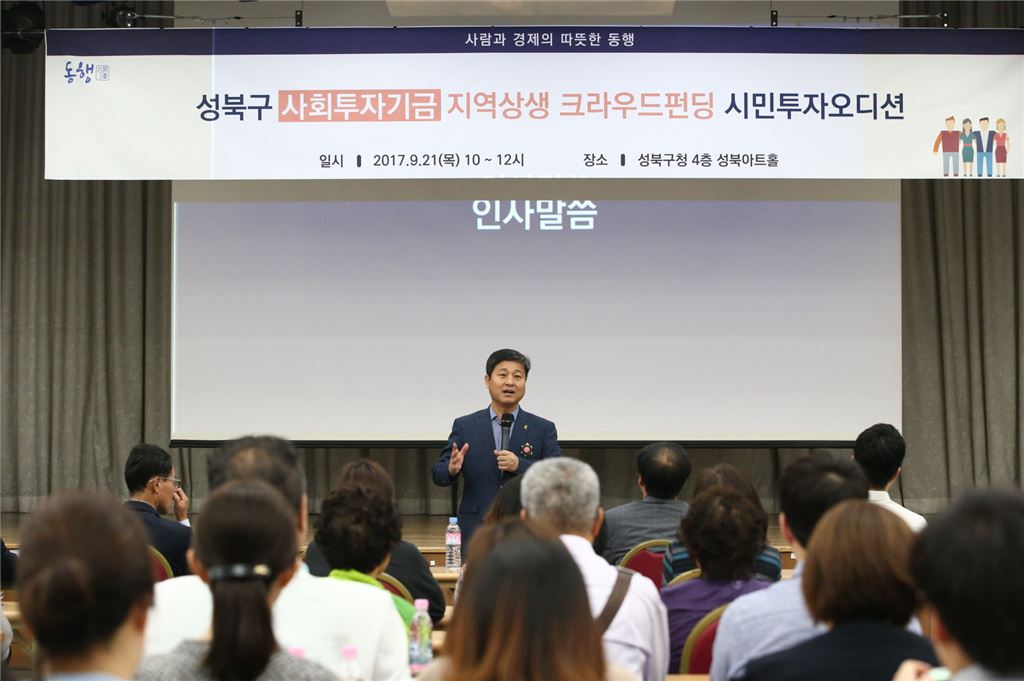 시민투자오디션 시작에 앞서 시민투자자들에게 인사말을 전하는 김영배 성북구청장