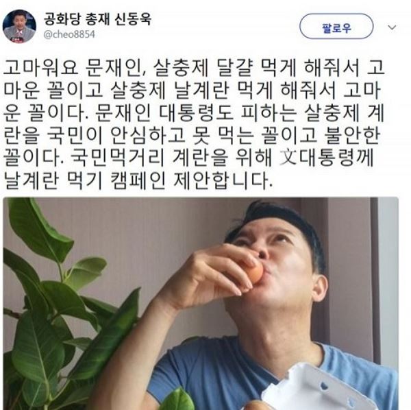 [아시아경제 온라인이슈팀]신동욱 공화당 총재가 충북샘물 악취 논란의 책임을 문재인 대통령에게 돌리는 글을 남긴가운데 과거 ‘살충제 달걀’ 파문 때 남긴 글도 눈길을 끌고 있다.신 총재는 ‘살충제 달걀’ 파문이 일었던 8월 자신의 트위터에 "고마워요 문재인, 살충제 달걀 먹게 해줘서 고마운 꼴이고 살충제 날계란 먹게 해줘서 고마운 꼴이다"라는 글과 함께 달걀을 먹는 사진을 게재했다.이어 "문재인 대통령도 피하는 살충제 계란을 국민이 안심하고 못 먹는 꼴이고 불안한 꼴이다"라며 "국민 먹거리 계란을 위해 문 대통령께 날계란 먹기 캠페인을 제안한다"고 덧붙였다.온라인이슈팀 issue@asiae.co.kr<ⓒ세계를 보는 창 경제를 보는 눈, 아시아경제(www.asiae.co.kr) 무단전재 배포금지>