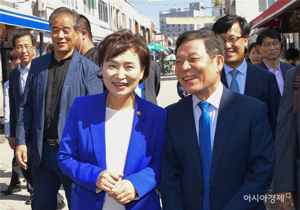 윤장현 광주광역시장이 22일 오전 김현미 국토교통부장관과 광산구 송정역시장을 방문해 대화를 나누고 있다./광주광역시 제공