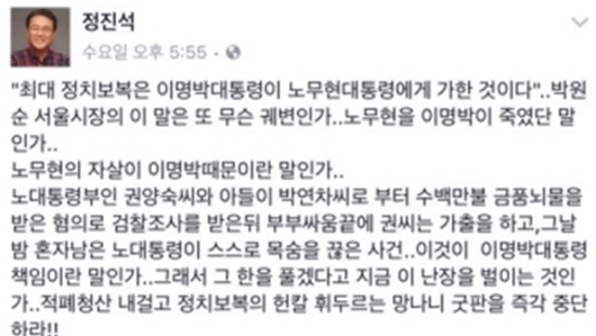 정진석 전 자유한국당 원내대표의 글을 향한 맹비난이 쏟아지고 있다. 지난 20일 정진석 전 의원은 자신의 페이스 북을 통해 노무현 전 대통령의 자살이 부인 권양숙 여사와 부부싸움 때문이라는 글을 올렸다. 이에 더불어민주당과 노무현 재단 등은 망언이라며 반발하며 정 전 대표를 명예훼손 혐의로 고발하겠다는 뜻을 밝힌 것. 정 전 의원의 페이스 북에는 “권양숙씨와 아들이 박연차씨로부터 수백만 달러의 금품 뇌물을 받은 혐의로 검찰 조사를 받은 뒤 부부싸움 끝에 권씨는 가출했고, 그날 밤 혼자 남은 노 대통령이 스스로 목숨을 끊은 사건”이라고 글을 게재 됐다. 그는 또 22일에는 “우파의 적폐가 있으면 좌파의 적폐도 있을 터... 불공정한 적폐청산은 갈등과 분열, 사회적 혼란만 남길 뿐”이라고 주장한 바도 있어 눈길을 끈다. 이에 대해 김현 민주당 대변인은 논평을 통해 “20일 정 의원이 페이스북에 쓴 노무현 대통령에 대한 부분은 명백한 허위사실 유포자 사자에 대한 명예훼손에 해당된다”고 주장하면서 “이명박 전 대통령 정무수석 출신인 정 의원의 고 노 전 대통령에 대한 부관참시는 장치인 이전에 사람으로서 가져야 할 기초적 예의조차 없는 최악의 막말과 망언이다. 정치적, 도의적 책임을 반드시 져야 한다”고 지적했다.노무현 재단도 논평을 내고 ‘정신 나간 망언’이라고 비판하며 “노 전 대통령 유족과 노무현 재단은 정진석의 발언이 명백한 거짓임을 밝힌다”고 일축했다. 이어 “정신 나간 망언은 인내의 한계를 넘어서는 일로 이에 대한 허위사실 유포로 인한 명예훼손으로 단호한 법적 조취를 취할 것”이라고 전했다.국민의당과 정의당도 정 전 대표의 글을 ‘부관참시’로 규정하고 검찰 수사를 촉구하는가 하면, 이용주 국민의당 의원은 개인 논평을 통해 “검찰은 즉각 사실관계 및 법리 검토를 통해 ‘사자’에 대한 명예훼손죄에 대한 수사에 착수해야 한다”고 주장했다.소식을 접한 누리꾼들은 “사실 관계를 떠나 고인에 대한 예의가 아니다”라는 반응을 보였다. 그러나 일각에서는 “사실 여부 확인해서 수사하면 확실하게 알 수 있는 일”이라는 반응을 보이기도 했다.미디어이슈팀 기자 <ⓒ세계를 보는 창 경제를 보는 눈, 아시아경제(www.asiae.co.kr) 무단전재 배포금지>