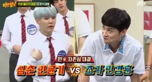 '아는 형님'의 시청률이 상승했다. 24일 닐슨코리아 집계에 따르면 23일 방송한 JTBC '아는형님'은 4.4%를 기록했다. 이는 지난 방송분이 기록한 4.0%보다 약 0.4%포인트 상승한 수치다. 이날 방송에는 대세를 넘어 정상에 오른 방탄소년단이 출연, 예능감을 뽐냈다. 특히 슈가는 본명이 민윤기라고 밝히며 민경훈의 삼촌 항렬로 밝혀져 눈길을 끌었다. 한편 방탄소년단은 신곡 'DNA'로 활동 중이며 오늘(24일) SBS '인기가요'에 출연한다. 미디어이슈팀 기자 <ⓒ세계를 보는 창 경제를 보는 눈, 아시아경제(www.asiae.co.kr) 무단전재 배포금지>
