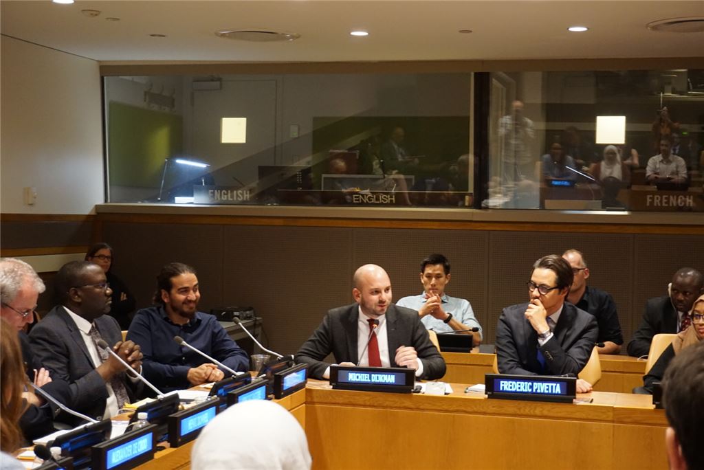 22일(현지시간) 뉴욕에서 열린 유엔총회 부대행사에서 삼성전자 베네룩스 법인의 사회공헌 담당자인 미힐 디크만(가운데)이 민관 협업 우수사례로 '몰렌긱(MolenGeek)' 프로그램을 발표하고 있다.