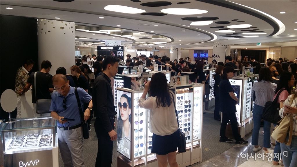 지난 23일 서울 명동에 위치한 롯데면세점 본점 내 선글라스 코너. 황금 연휴를 앞두고 내국인 고객들로 붐비고 있다.(사진=오종탁 기자)