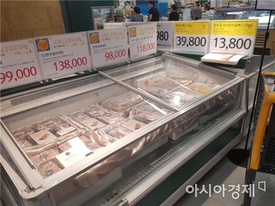 주말내내 둘러본 국내 주요 마트에서 '한우' 인기가 좋았다. '3년 만의 최저가'라고 할 정도로 한우 가격이 떨어지면서 수요가 몰린 것. 축산물품질평가원에 따르면 추석을 한 달 앞두고 5일간 평균 한우 도매가(1등급·1㎏ 기준)는 2015년 1만8678원에서 지난해 1만8881원까지 올랐다가 올해 1만7706원으로 낮아졌다.9월23일 찾은 이마트 영등포점. 손님들이 홍삼, 녹용 등의 추석 선물세트를 살펴보고 있다. 사진=이선애 기자 lsa@