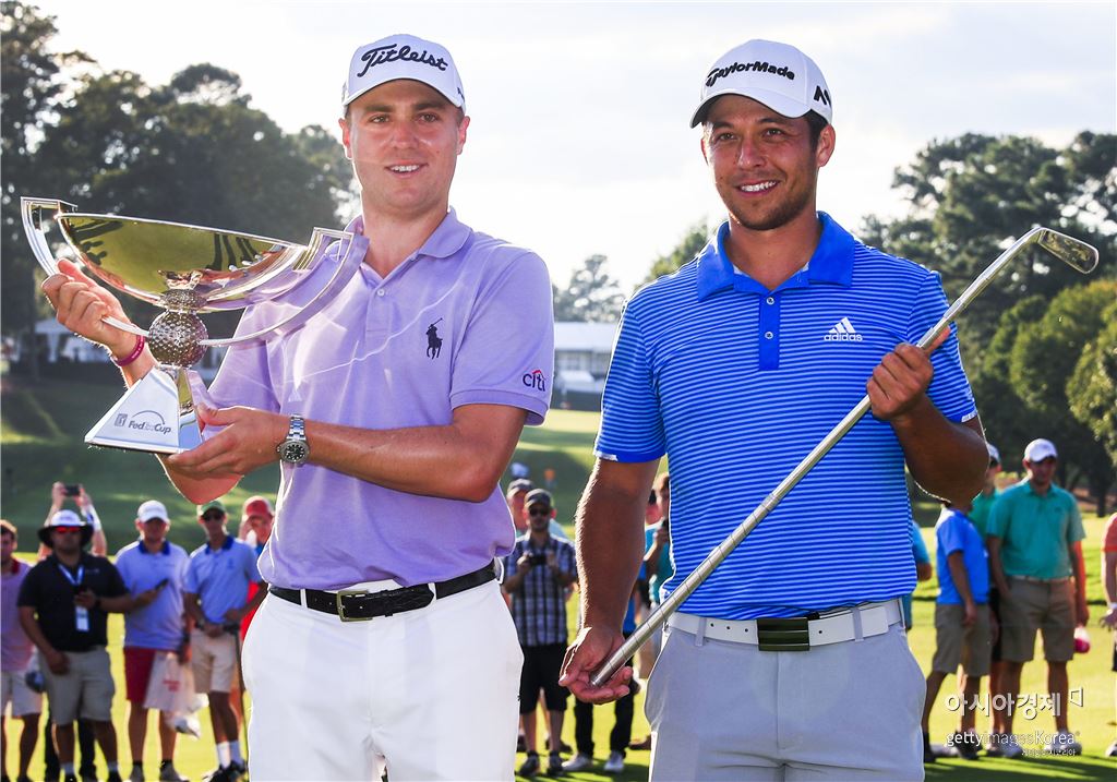 저스틴 토머스(왼쪽)가 페덱스컵(PO) 우승컵을 들고 '투어챔피언십 챔프' 잰더 셔펠레와 함께 기념 촬영을 하고 있다. 애틀랜타(美 조지아주)=Getty images/멀티비츠