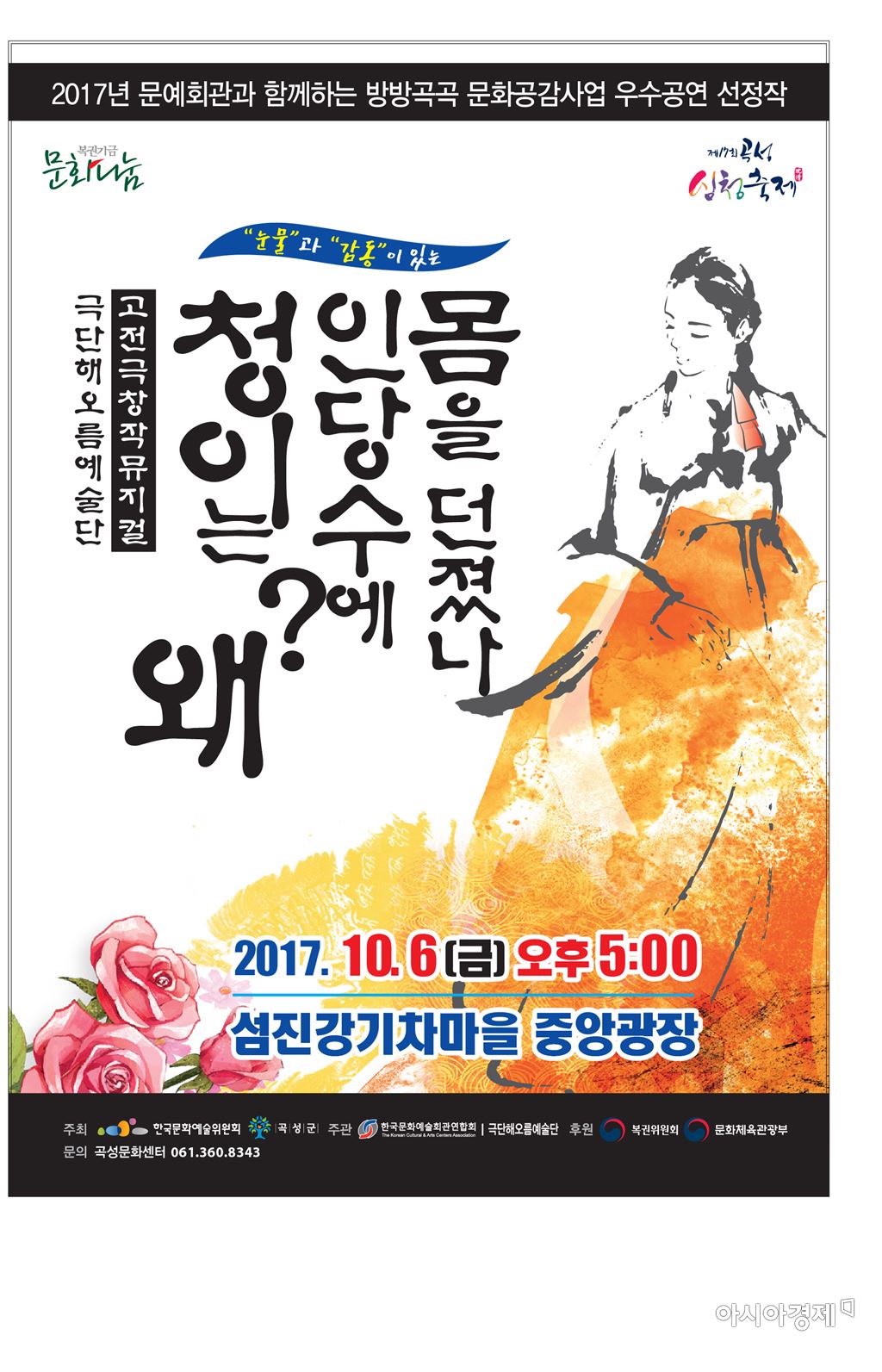 [아시아경제 노해섭 기자]제17회 곡성심청축제가 열리는 곡성섬진강 기차마을에 초대형 뮤지컬이 화려한 배우진과 튼튼한 스토리를 가지고 추석명절 관람객을 찾아온다. ‘효와 함께 열어가는 행복한 세상’을 주제로 열리는 제17회 곡성심청축제(10월 6일 ~ 10월 9일)을 뮤지컬 초청작인 ‘청이는 왜 인당수에 몸을 던졌나’뮤지컬 공연을 시작으로 화려한 축제의 시작을 알릴 예정이다.곡성군(군수 유근기)은 다음달 6일 오후 5시에 섬진강기차마을 중앙무대에서 창작뮤지컬 ‘청이는 왜 인당수에 몸을 던졌나’ 공연을 올린다.어려운 형편 속에서도 기품과 예의를 잃지 않는 꿋꿋하고 효심이 깊은 심청의 이야기로, 판소리 ‘심청가’의 대목을 기본으로 남녀노소 누구나 거리낌 없이 듣고 이해할 수 있도록 현대극으로 바꾸고 구어화시킨 것이 특징이다.심청 역은 차세대 유망 탤런트 한혜성 씨가, 심봉사 역은 2016년 올해의 배우상을 수상한 탤런트 김영 씨가 연기한다. 두 사람은 부녀지간의 애절한 부정(父情)을 선보일 방침이다. 아울러 탤런트 장두이가 해설자로 활동하고 이밖에 최상길, 김미경, 오상원 등 실력이는 배우 15여 명이 창작곡과 힙합, 대중가요 등 다양한 장르의 음악과 춤으로 뜨거운 무대를 선사한다. 자세한 사항은 곡성군청 관광문화과 (061-360-8362)로 문의하면 안내받을 수 있다.노해섭 기자 <ⓒ세계를 보는 창 경제를 보는 눈, 아시아경제(www.asiae.co.kr) 무단전재 배포금지>