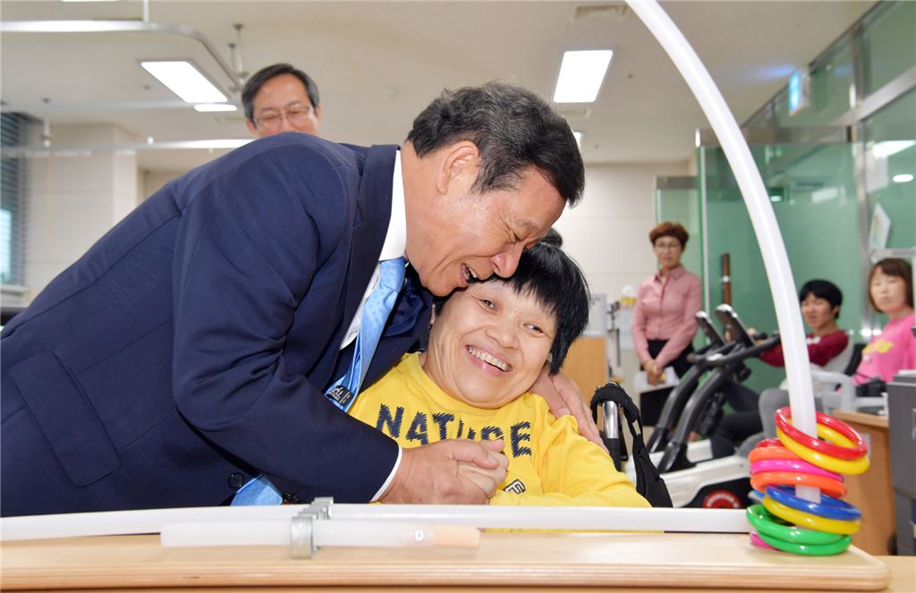 [아시아경제 노해섭 기자]윤장현 광주광역시장이 추석 명절을 앞두고 25일 오전 북구 본촌동 소재 사회복지법인 가교행복빌라를 방문해 장애인들을 격려하고 있다.