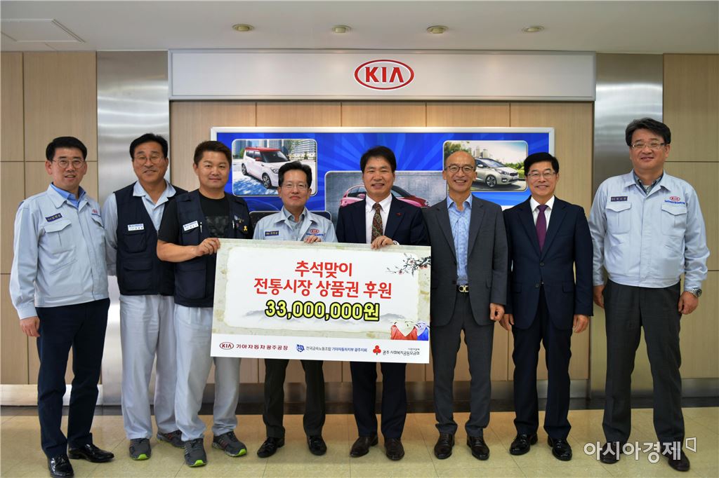 기아자동차 광주공장(공장장 정찬민)이 민족 대명절인 추석을 맞아 광주지역 전통시장 활성화 정책에 부응하고 저소득층 이웃과 사랑을 나누기 위해 자매결연을 맺고 후원중인 복지시설을 대상으로 전통시장상품권 전달식을 실시했다.