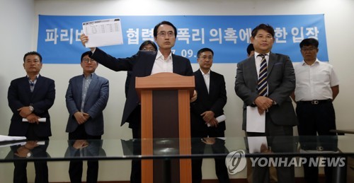 [이미지출처=연합뉴스]25일 오후 경기도 성남시 분당구 국제산업 사무실에서 열린 파리바게뜨 협력사 폭리 의혹에 대한 입장 발표 기자회견에서 정홍 국제산업 대표(앞줄 가운데)가 용역비 등급별 현황표를 공개하고 있다.