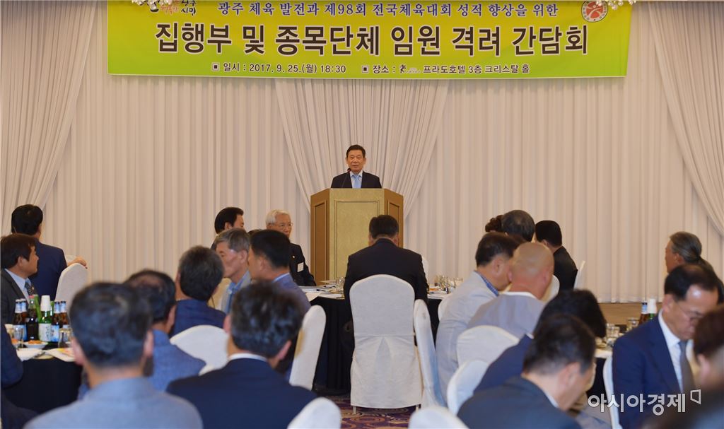 [아시아경제 노해섭 기자]윤장현 광주광역시장이 25일 오후 남구 프라도호텔에서 김창준 시체육회 상임고문, 김응식 수석부회장, 집행부 임원 및 종목단체 회장 등 관계자 200여명이 참석한 가운데 열린 ‘제98회 전국체육대회 성적 향상을 위한 집행부 및 종목단체 임원 격려 간담회’에 참석해 인사말을 하고 있다.