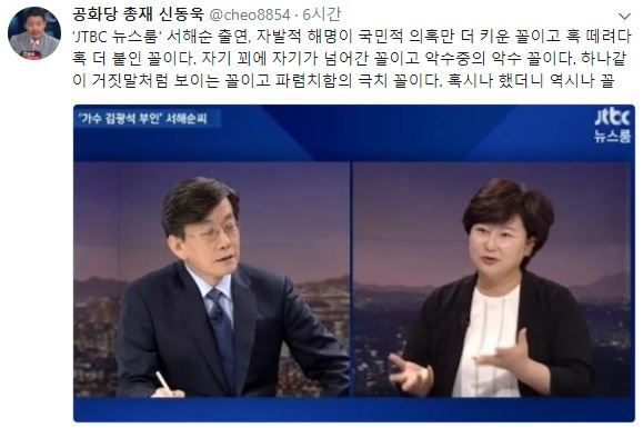 [아시아경제 온라인이슈팀]신동욱 공화당 총재가 ‘JTBC 뉴스룸’에 출연한 서해순씨에 대해 “파렴치함의 극치다”라고 평했다.신 총재는 26일 자신의 트위터에 전날(25일) 출연한 서씨를 언급하며 “‘JTBC 뉴스룸’ 서해순 출연, 자발적 해명이 국민적 의혹만 더 키운 꼴이고 혹 떼려다 혹 더 붙인 꼴이다”는 글을 적었다.그는 이어 서씨가 “자기 꾀에 자기가 넘어간 꼴이고 악수 중의 악수 꼴이다”라며 “하나같이 거짓말처럼 보이는 꼴이고 파렴치함의 극치 꼴이다. 혹시나 했더니 역시나 꼴”이라고 밝혔다.한편 1996년 1월 숨진 가수 김광석의 부인인 서씨는 ‘고인과 딸 김서연 양의 사망의 배후에 있다’는 의혹이 제기돼 왔다.서씨는 ‘뉴스룸’에서 딸의 죽음을 알리지 않은 이유를 “경황이 없었기 때문”이라고 해명했으며 고 김광석의 죽음과 관련된 의문에 대해서도 “당시 경황이 없었다. 기억이 잘 안난다”고 답했다.<center><div class="slide_frame"><input type="hidden" id="slideIframeId" value="2017092014114362990A">