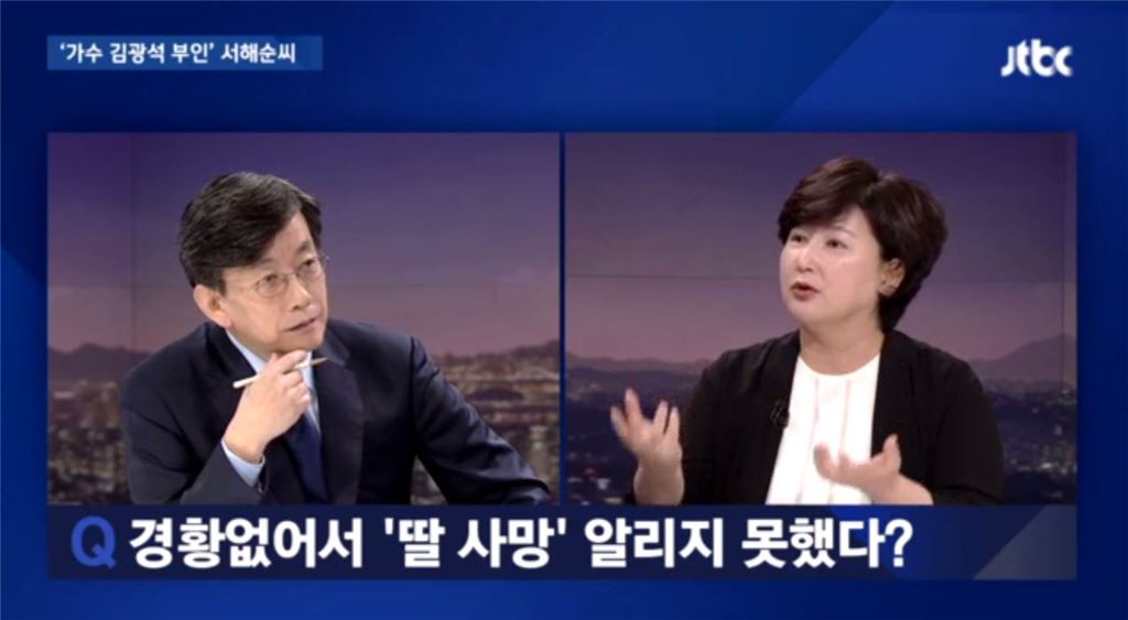 [아시아경제 온라인이슈팀]고(故) 김광석 아내 서해순씨가 김광석 타살 의혹과 10년 전 죽은 딸의 소식을 의도적으로 숨겼다는 의혹에 대해 25일 JTBC ‘뉴스룸’에 출연해 적극적으로 해명했다. 또 저작권 관련 재판에 대해서도 입장을 밝혔다. 1996년 故 김광석의 저작권을 갖고 있던 김광석 아버지가 서해순과의 ‘로열티 청구권 확인 소송’에서 자신이 사망한 후엔 며느리 서해순과 딸 김서연이 김광석 음반 저작권을 갖기로 합의했다. 김광석 아버지가 사망하고 4년 후인 2008년, 서해순은 김광석 친동생과 ‘김광석 음반 저작권 소송’을 진행했고, 당시 대법원은 김광석 씨 음반의 저작권에 대해 서해순과 딸 김서연의 권리를 인정하는 판결을 내렸다. 1.서해순 씨 딸인 서연 양은 2007년 사망2008년부터 최근까지 이 판결에 대한 의혹은 없었지만, 김광석 씨 유족 측이 김서연 양의 모습이 보이지 않자 2017년 9월 19일 실종신고를 했고, 이 과정에서 서연 양의 사망 사실이 10년 만에 알려졌다. 2. 대법원 판결 당시 김서연 양의 사망 사실을 몰랐다서연 양의 사망 시점이 2008년 음반 저작권 대법원 판결 전인 2007년에 사망했다는 것이 10년 후인 현재 밝혀졌고, 2008년 당시 법원 판결에서는 피고인으로 김서연 양이 있었다. 3. 서 씨는 가족들에게 서연 양의 사망 사실을 명확하게 알리지 않았다법원 판결로 인해 피고인 중 한 명이었던 딸에게 저작권 권리가 돌아가게 됐으나, 딸은 이미 사망한 상태였고, 당시 서해순 씨는 딸의 사망 소식을 주변 가족들에게 명확하게 알리지 않았다. <center><div class="slide_frame"><input type="hidden" id="slideIframeId" value="2017092014114362990A">