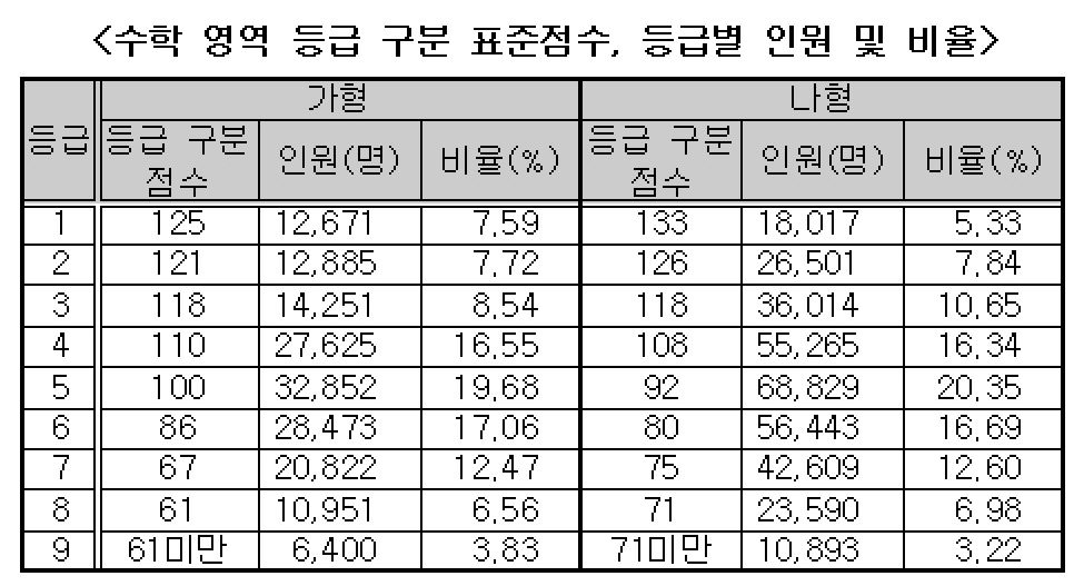 [아시아경제 조인경 기자] 지난 6일 치러진 2018학년도 대학수학능력시험 9월 모의평가는 지난해 시행된 수능에 비해 수학이 다소 어려웠던 것으로 나타났다. 절대평가로 전환된 영어영역에서 1등급을 받은 학생이 약 2만7700명으로 6월 모의평가 때보다 1만4000명 이상 급감했다.한국교육과정평가원은 수능 9월 모의평가 채점결과 표준점수 최고점이 국어영역 134점, 수학 가형이 131점, 수학 나형이 142점이었다고 26일 밝혔다.2017학년도 수능 표준점수 최고점은 국어영역이 139점, 수학 가형은 130점, 수학 나형은 137점이었다.국어영역은 최고점이 5점 내려갔지만 수학의 경우 가형과 나형이 각 1점과 5점 상승한 셈이다.표준점수는 학생의 원점수가 평균성적과 얼마나 차이 나는지 나타내는 점수다. 시험이 어려우면 평균이 낮아져 표준점수 최고점이 올라가고, 시험이 쉬우면 반대로 표준점수 최고점이 내려간다.국어영역은 지난해 수능에서 문제 유형이 다소 바뀌어 어려웠다는 평가를 받은 바 있다.표준점수 최고점을 받은 학생 비율 역시 0.30%로 지난해 수능(0.23%)이나 올해 6월 모의평가(0.14%)보다 늘었다.반면 수학은 9월 모의평가에서 변별력이 높은 문제를 통해 난도가 다소 높아진 것으로 풀이된다.1등급과 2등급이 나뉘는 등급구분 표준점수(1등급 커트라인) 역시 국어영역은 128점으로 지난해 수능(130점)보다 2점 낮아졌다.이에 비해 수학 가형은 125점, 수학 나형은 133점으로 지난해 수능보다 각각 1점과 2점 상승했다.지난해 수능에서 상대평가 1등급(약 4%)을 받은 학생은 2만4000여명이었다.시기자 평가원 대학수학능력시험본부 기획분석실장은 "1등급 비율이 6월 모평과 2.7%포인트 가량 차이나는데 출제 기조는 유지했으나 응시생 특성에 변화가 있었던 것으로 생각한다"며 "절대평가에서는 난도를 일정하게 유지해도 응시생의 성취도나 학업 수준에 따라 1등급 학생 수가 바뀔 수 있다"고 말했다.탐구영역 가운데는 사회과목의 1등급 커트라인은 생활과 윤리 63점, 윤리와 사상 65점, 한국 지리 68점, 세계 지리 67점, 동아시아사 68점, 세계사 66점, 법과 정치 65점, 경제 69점, 사회·문화 64점이었다.과학탐구의 경우 1등급 커트라인은 물리Ⅰ 65점, 화학Ⅰ 66점, 생명 과학Ⅰ 67점, 지구 과학Ⅰ 69점, 물리Ⅱ 71점, 화학Ⅱ 68점, 생명 과학Ⅱ 69점, 지구 과학Ⅱ 67점으로 나타났다.사회탐구의 경우 법과 정치를 제외하고 모든 영역의 1등급 커트라인이 지난해 수능과 같거나 1∼4점 높았고, 과학탐구도 물리Ⅰ을 제외한 모든 영역의 커트라인이 지난해 수능과 같거나 2∼5점 높았다.직업탐구 역시 1등급 커트라인이 전반적으로 높아졌다.제2외국어·한문영역의 경우 아랍어의 표준점수 최고점이 74점으로 제일 높았고, 스페인어와 일본어가 62점으로 가장 낮았다.필수과목인 한국사영역에서는 원점수 40점 이상을 받은 1등급 학생이 18만5045명(35.96%)으로 지난해(21.77%)보다 많이 늘었다.조인경 기자 ikjo@asiae.co.kr<ⓒ세계를 보는 창 경제를 보는 눈, 아시아경제(www.asiae.co.kr) 무단전재 배포금지>