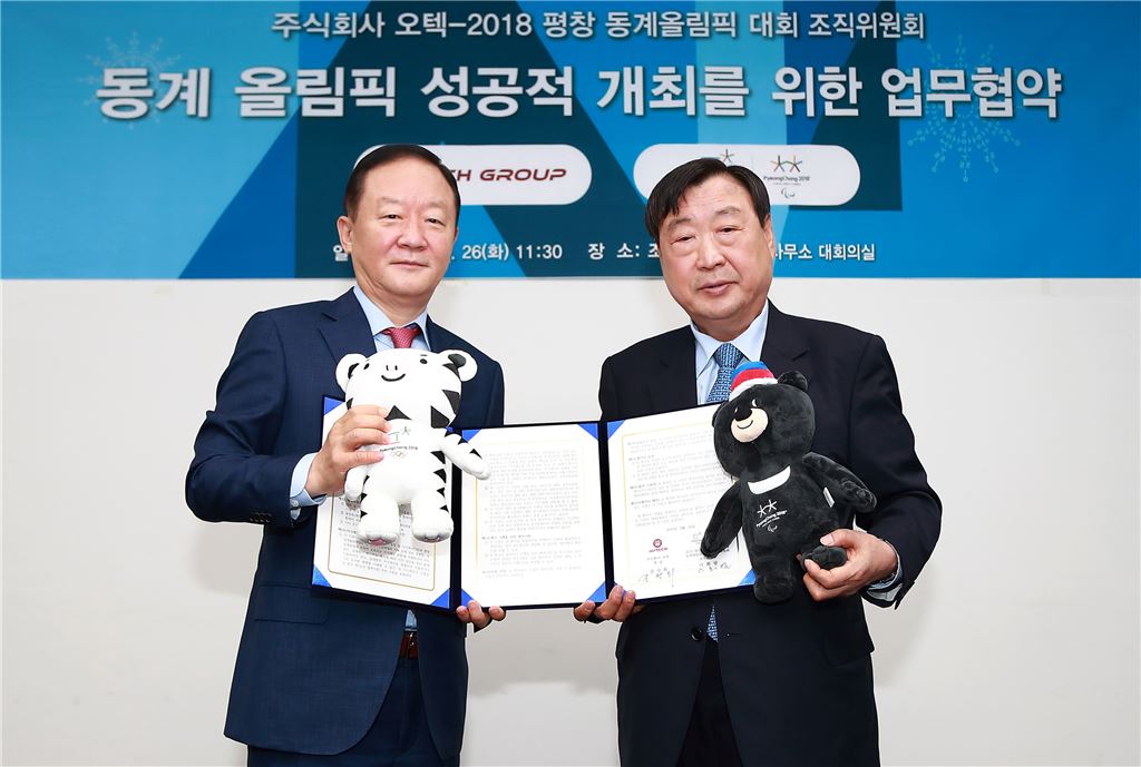 2018 평창 동계올림픽대회 및 동계패럴림픽대회 조직위원회와 ㈜오텍은 26일 조직위 서울사무소에서 ‘대회 휠체어차량 정비·인프라 및 교육지원’ 등을 내용으로 하는 업무협약을 체결했다. 강창희 오텍 회장(왼쪽)과 이희범 조직위원장. [사진= 평창 동계올림픽대회 및 동계패럴림픽대회 조직위원회 제공]