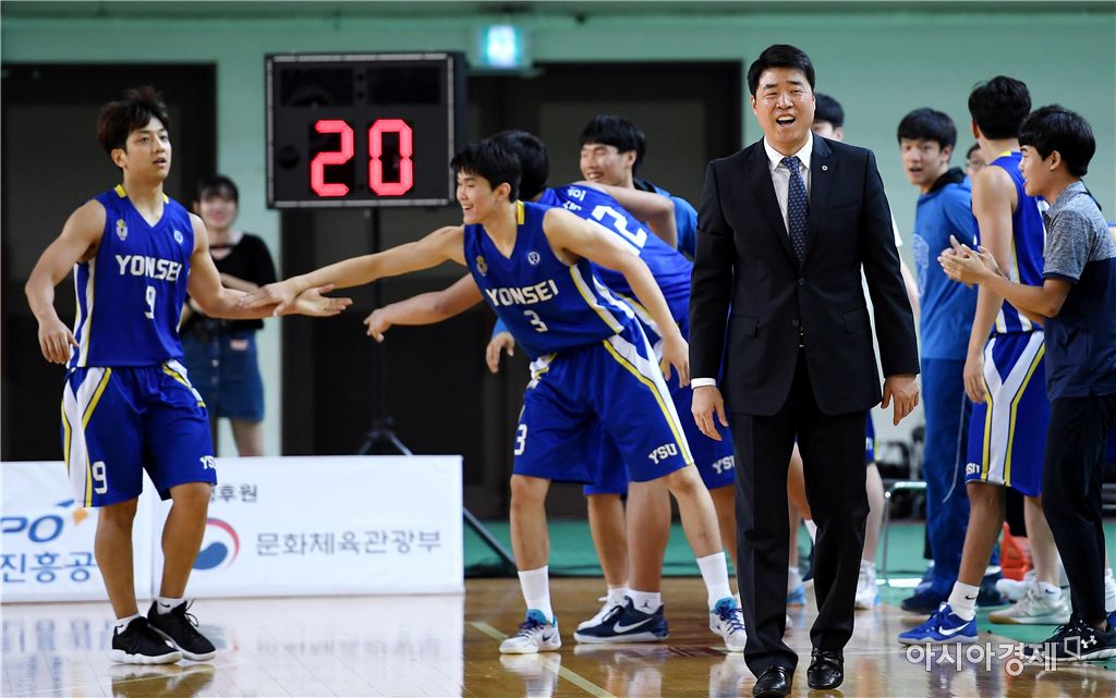 [아시아경제 김현민 기자]2017 대학 농구리그 챔피언결정전 1차전 고려대와 연세대의 경기가 26일 고려대 화정체육관에서 열렸다. 연세대 은희석 감독이 허훈의 활약을 지켜보며 미소 짓고 있다. 김현민 기자 kimhyun81@asiae.co.kr<ⓒ세계를 보는 창 경제를 보는 눈, 아시아경제(www.asiae.co.kr) 무단전재 배포금지>