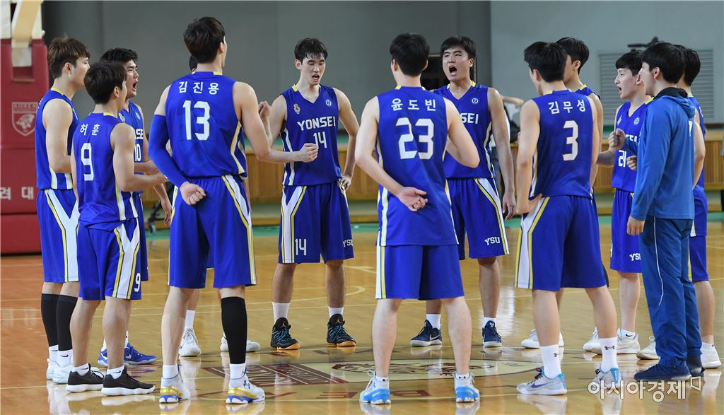 [아시아경제 김현민 기자]2017 대학 농구리그 챔피언결정전 1차전 고려대와 연세대의 경기가 26일 고려대 화정체육관에서 열렸다. 연세대 선수들이 83-57로 이긴 뒤 응원가 세리머니를 하고 있다. 김현민 기자 kimhyun81@asiae.co.kr<ⓒ세계를 보는 창 경제를 보는 눈, 아시아경제(www.asiae.co.kr) 무단전재 배포금지>