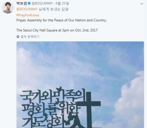 배우 박보검이 자신이 다니고 있는 교회 홍보 글을 자신의 트위터에 올리면서 네티즌들 사이에서 치열한 난상토론이 벌어지고 있다. 25일 박보검은 자신의 트위터를 통해 '국가와 민족의 평화를 위한 기도성회'라는 글이 적힌 사진을 게재했다. 이는 박보검이 다니고 있는 '예수중심교회'에서 열리는 기도회다.이런 가운데 네티즌들은 박보검의 이 같은 트위터 메시지를 놓고 난상토론을 벌이고 있다. 한 네티즌은 "결국 팬들도 전도의 대상으로 보고 있는 건가"라고 의견을 밝히는가 하면 또 다른 네티즌은 “함께해요 기도합니다" 등의 상반된 의견을 보였다. 그런가 하면 "범죄 저지를 것도 아닌데 개인 자유 공간에 이래라저래라"라고 주장한 네티즌 의견도 나왔다. 이에 대해 또 다른 네티즌은 "믿을 거면 혼자 믿을 것이지 무슨 홍보"라고 받아쳤다. 온라인이슈팀 issue@asiae.co.kr<ⓒ세계를 보는 창 경제를 보는 눈, 아시아경제(www.asiae.co.kr) 무단전재 배포금지>