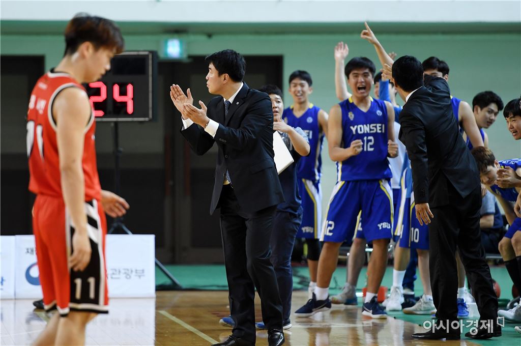 [아시아경제 김현민 기자]2017 대학 농구리그 챔피언결정전 1차전 고려대와 연세대의 경기가 26일 고려대 화정체육관에서 열렸다. 연세대 벤치의 선수단이 3쿼터 점수차가 벌어지자 환호하고 있다. 김현민 기자 kimhyun81@asiae.co.kr<ⓒ세계를 보는 창 경제를 보는 눈, 아시아경제(www.asiae.co.kr) 무단전재 배포금지>