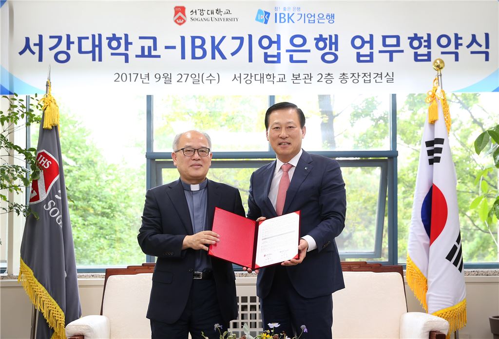 27일 서울 마포구 서강대에서 김도진 기업은행장(오른쪽)과 박종구 서강대학교 총장이 협약식을 마치고 기념촬영을 하고 있다.(사진 : 기업은행)