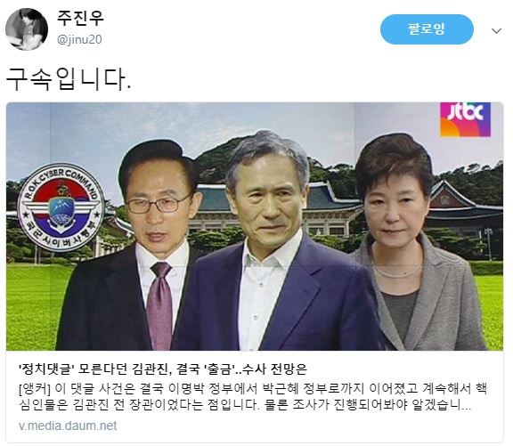 주진우 시사IN 기자가 자신의 소셜네트워크(SNS)에서 김관진 전 국방부 장관 수사 전망을 언급했다.주진우 기자는 27일 오후 자신의 트위터에 검찰이 군 사이버사령부 ‘댓글부대’ 운영 의혹과 관련해 김 전 장관에 대해 출국금지 조치를 내렸다는 한 언론사의 보도를 공유했다.이와 함께 주진우 기자는 “구속입니다”라는 글을 적어, 김 전 장관의 수사 전망에 대한 견해를 밝혔다.한편 김 전 장관은 국방부 장관으로 재직하던 당시, 2012년 대선과 총선을 앞두고 자신의 휘하에 있는 사이버사가 진행하는 각종 댓글공작을 기획·지휘하면서 개입했다는 의혹을 받았다.이에 김 전 장관은 검찰에 의해 출국금지를 당한 것으로 이날 확인됐다.또한 검찰은 김 전 장관이 이명박 전 대통령에게 사이버사령부의 댓글 활동을 보고한 정황이 담긴 문서를 확보했다고 전해졌다. 이 문서에는 'V'라는 표기가 있었다고 한다. 검찰은 이를 'VIP'를 가리키는 것으로 추정하는 것으로 알려졌다.온라인이슈팀 issue@asiae.co.kr<ⓒ세계를 보는 창 경제를 보는 눈, 아시아경제(www.asiae.co.kr) 무단전재 배포금지>