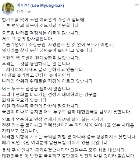 [아시아경제 고정호 기자]이명박 정부 시절 ‘MB블랙리스트’와 ‘관건 선거’ 등의 의혹이 제기되는 가운데 이명박 전 대통령이 자신의 소셜네트워크(SNS)를 통해 입장을 표명했다.이 전 대통령은 28일 자신의 페이스북에 “한가위를 맞아 국민 여러분의 가정과 일터에 두루 평안과 행복이 깃드시길 기원합니다”라고 시작하는 글을 올렸다.이 전 대통령은 이어 “전전 정부를 둘러싸고 적폐청산이라는 미명 하에 일어나고 있는 사태를 지켜보고 있습니다”라며 “이러한 퇴행적 시도는 국익을 해칠 뿐 아니라 결국 성공하지도 못합니다”라고 적었다.이 전 대통령은 또한 “때가 되면 국민 여러분께 말씀드릴 기회가 있을 것입니다”라면서 “올해 추석 인사가 무거워졌습니다만 그럴수록 모두 힘을 내십시다. 대한민국은 이 난관을 극복하고 중단없이 발전해 나갈 것이라 믿습니다”라고 덧붙였다.고정호 기자 jhkho2840@asiae.co.kr<ⓒ세계를 보는 창 경제를 보는 눈, 아시아경제(www.asiae.co.kr) 무단전재 배포금지>