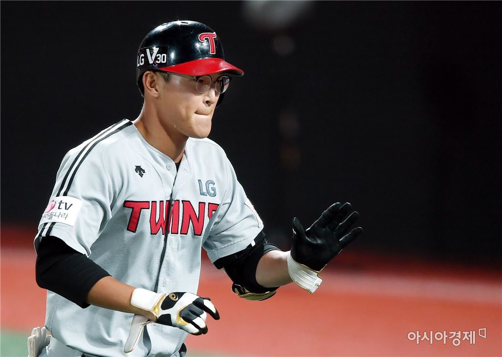 [수원=아시아경제 김현민 기자]프로야구 두산 베어스와 kt 위즈의 2017 KBO리그 경기가 28일 수원 kt위즈파크에서 열렸다. 4회초 1사 1루에서 LG 문선재가 추가 투런 홈런을 치고 대기 타석의 박용택과 하이파이브하고 있다. 김현민 기자 kimhyun81@asiae.co.kr<ⓒ세계를 보는 창 경제를 보는 눈, 아시아경제(www.asiae.co.kr) 무단전재 배포금지>