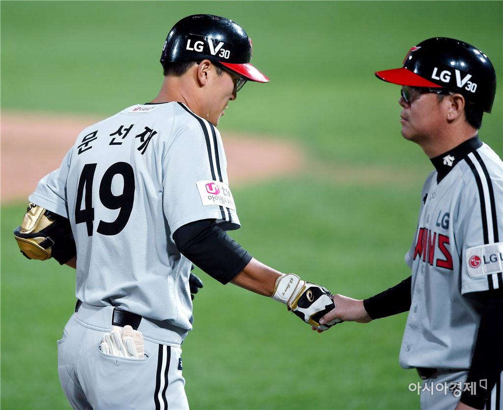 [수원=아시아경제 김현민 기자]프로야구 두산 베어스와 kt 위즈의 2017 KBO리그 경기가 28일 수원 kt위즈파크에서 열렸다. 4회초 1사 1루에서 LG 문선재가 추가 투런 홈런을 치고 유지현 코치와 하이파이브하고 있다. 김현민 기자 kimhyun81@asiae.co.kr<ⓒ세계를 보는 창 경제를 보는 눈, 아시아경제(www.asiae.co.kr) 무단전재 배포금지>