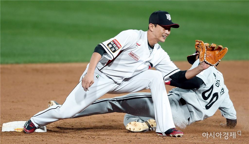 [수원=아시아경제 김현민 기자]프로야구 두산 베어스와 kt 위즈의 2017 KBO리그 경기가 28일 수원 kt위즈파크에서 열렸다. 4회초 무사 1루에서 LG 강승호의 번트 때 1루주자 백승현이 2루에서 아웃되고 있다. kt 유격수는 박기혁.김현민 기자 kimhyun81@asiae.co.kr<ⓒ세계를 보는 창 경제를 보는 눈, 아시아경제(www.asiae.co.kr) 무단전재 배포금지>