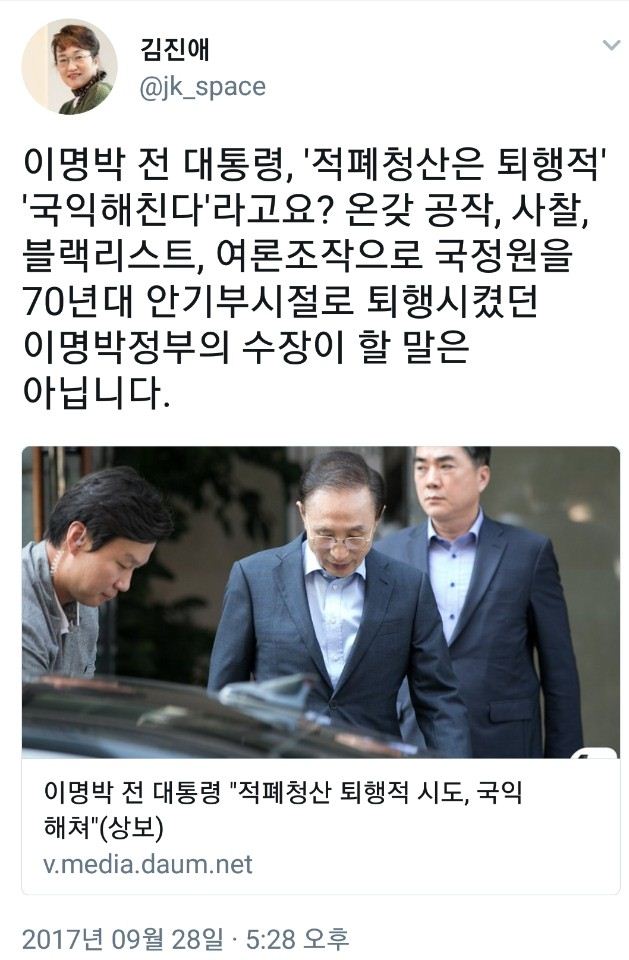 28일 김진애 전 민주당 의원은 현 정부의 적폐청산 작업을 비판한 이명박 전 대통령에 대한 생각을 밝혔다. /사진= 김진애 전 민주당 의원 트위터