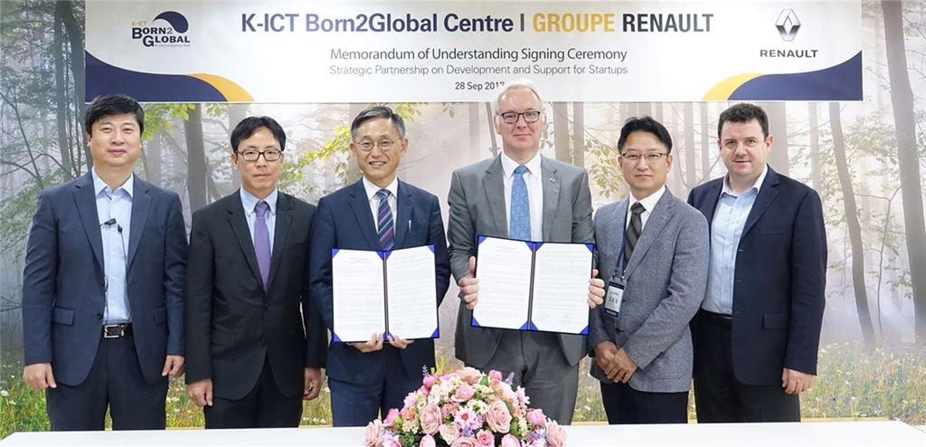 28일 열린 르노그룹과 본투글로벌센터의 MOU 체결식. (왼쪽부터)김태욱 본투글로벌센터 팀장, 최준환 과학기술정보통신부 과장, 김종갑 본투글로벌센터 센터장, 스테판 마빈 르노그룹 상무, 김호웅 르노삼성 수석, 마크 보사 르노삼성 수석<br />