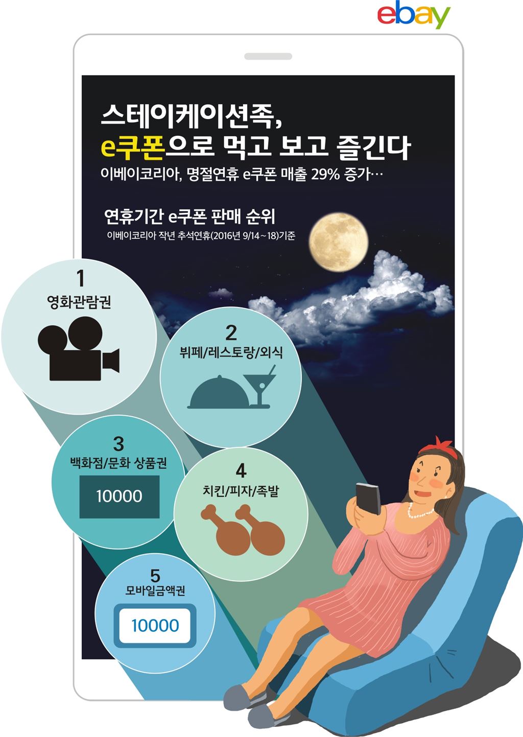 [아시아경제 지연진 기자]추석 황금연휴가 하루 앞으로 다가온 가운데 '스테이케이션족'이 유통업계 큰 손으로 떠올랐다. 29일 G마켓과 옥션 등 오픈마켓을 운영하는 이베이코리아가 e쿠폰 카테고리 매출을 조사한 결과 지난 17일~23일 e쿠폰 판매량은 직전주 대비 29% 증가했다. 올해 5월 황금연휴 직전 주 매출 증가(9%)와 지난해 추석 직전 주 증가(10%)에 비해 매우 큰 폭의 증가세다. 작년 추석연휴 e쿠폰 판매순위는 영화관람권이 가장 인기가 많았고, 뷔페·외식, 백화점·문화상품권이 뒤를 이었다. 치킨, 피자 등 배달음식과 햄버거, 베이커리, 도넛, 커피 등 간단히 집 앞에서 해결할 수 있는 식음료, 편의점 교환권도 판매 순위도 높았다. 배달음식 중에선 치킨과 피자가 압도적으로 높았다. 이베이코리아는 황금연휴기간 수요가 높은 품목을 대상으로 다양한 프로모션을 준비했다. G마켓에서는 2인 관람권과 팝콘(R) 1개, 음료(R) 1개가 포함된 메가박스 콤보패키지를 35% 할인한 1만6900원에 구입 가능하며, 롯데시네마 영화관람권은 23% 할인한 7700원에 이용할 수 있다. 옥션에서는 CGV 주중, 주말예매권을 30% 저렴한 7000원에 구입할 수 있다.외식상품권도 준비했다. G마켓에서는 찹스테이크와 빠네파스타, 케이준치킨샐러드와 음료 2잔이 포함된 TGIF 2인세트를 스마일페이로 결제할 경우, 55% 할인한 2만9900원에 구입할 수 있다. 아웃백 갈릭립아이와 투움바파스타(4만4800원), 다음달 9일까지 사용 가능한 더 리버사이드호텔 더 가든치킨 1인 뷔페권(4만6080원) 등도 모두 할인 가격에 구입 가능하다. 옥션은 추석특가로 나온 TGIF 부채살 스테이크 2인세트를 3만3900원에, 잭다니엘 찹스테이크 4인세트를 4만500원에 준비했다. 두 상품 모두 50% 이상 할인이 적용된 상품이다. 배달음식의 경우 추석 당일을 제외하고는 연휴 기간 동안 대부분 배달 가능하다. G마켓에서는 멕시카나와 치킨매니아, 7번가피자의 모든 메뉴를 각각 2000원, 3000원, 4000원씩 할인하며, 치킨매니아의 경우 새롭게 출시된 스윗블랙 주문 시 4000원 더 할인한 가격으로 구입 가능한 이벤트를 진행한다.지연진 기자 gyj@asiae.co.kr<ⓒ세계를 보는 창 경제를 보는 눈, 아시아경제(www.asiae.co.kr) 무단전재 배포금지>