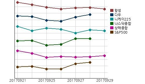 전일 뉴욕증권거래소에서 나스닥종합지수는 전일 대비 0.19포인트(0%) 오른 6453.45로 마감됐고, S&P500지수는 전일 대비 3.02포인트(0.12%) 오른 2510.06로 마감됐다. 또한 다우산업지수는 전일 대비 40.49포인트(0.18%) 오른 22381.2로 마감됐다.유럽증시는 독일 DAX30증시가 47.24포인트(0.37%) 상승하여 12704.65를 기록하는 등 프랑스 CAC40, 영국 FTSE100증시가 상승세를 보이는 반면, 이탈리아 FTSE MIB증시가 34.52포인트(0.15%) 하락하여 22587.67를 기록하는 등 러시아 RTS증시가 하향세를 보였다.아시아증시는 현재 항셍, 항셍차이나대기업 (R), 대만가권, 상해A, 홍콩H, 상해종합, 상해B증시가 상승세를 보이는 반면, 니케이225, 인도네시아 IDX종합, 말레이시아 KLCI증시가 하향세를 보이고 있다.국내금시세