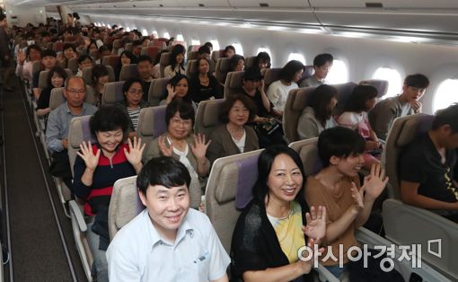 [아시아경제 강진형 기자]추석연휴를 앞둔 29일 오후 인천국제공항에서 오사카로 첫 운항하는 아시아나항공기 A350 3호기에 탑승한 승객들이 손을 흔들고 있다.강진형 기자 aymsdream@asiae.co.kr<ⓒ세계를 보는 창 경제를 보는 눈, 아시아경제(www.asiae.co.kr) 무단전재 배포금지>