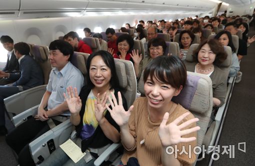 [아시아경제 강진형 기자]추석연휴를 앞둔 29일 오후 인천국제공항에서 오사카로 첫 운항하는 아시아나항공기 A350 3호기에 탑승한 승객들이 손을 흔들고 있다.강진형 기자 aymsdream@asiae.co.kr<ⓒ세계를 보는 창 경제를 보는 눈, 아시아경제(www.asiae.co.kr) 무단전재 배포금지>