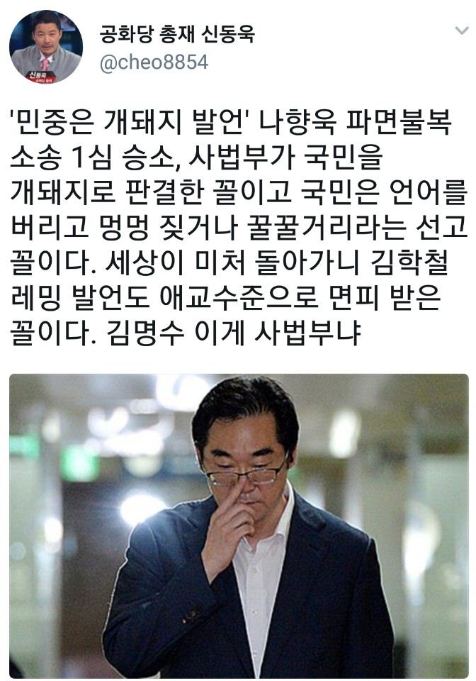 신동욱 공화당 총재가 나향욱 전 교육정책기획관의 파면 처분 취소 소송에 대한 승소 판결이 난 것을 두고 김명수 신임 대법원장을 비판했다.29일 신 총재는 자신의 트위터에 "'민중은 개돼지 발언' 나향욱 파면 불복 소송 1심 승소, 사법부가 국민을 개돼지로 판결한 꼴이다"라며 "국민은 언어를 버리고 멍멍 짖거나 꿀꿀거리라는 선고 꼴이다"라고 올렸다.이어 "세상이 미처 돌아가니 김학철 레밍 발언도 애교 수준으로 면피 받은 꼴이다"라며 "김명수 이게 사법부냐"라고 김명수 신임 대법원장을 언급했다.이날 서울행정법원 행정4부(김국현 부장판사)는 나 전 기획관이 교육부 장관을 상대로 낸 파면 처분 취소 소송에서 원고 승소로 판결했다.나 전 기획관은 지난해 7월 한 언론사 기자들과 저녁 식사 중 "민중은 개, 돼지다", "신분제를 공고화해야 한다"고 말한 사실이 알려져 논란에 휩쓸렸다.온라인이슈팀 issue@asiae.co.kr<ⓒ세계를 보는 창 경제를 보는 눈, 아시아경제(www.asiae.co.kr) 무단전재 배포금지>
