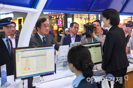 [아시아경제 강진형 기자]역대 최장 추석연휴 시작을 하루 앞둔 29일 오후 서울 용산구 서울역을 방문한 이낙연 국무총리가 안내센터 직원과 대화 하고 있다.강진형 기자 aymsdream@asiae.co.kr<ⓒ세계를 보는 창 경제를 보는 눈, 아시아경제(www.asiae.co.kr) 무단전재 배포금지>