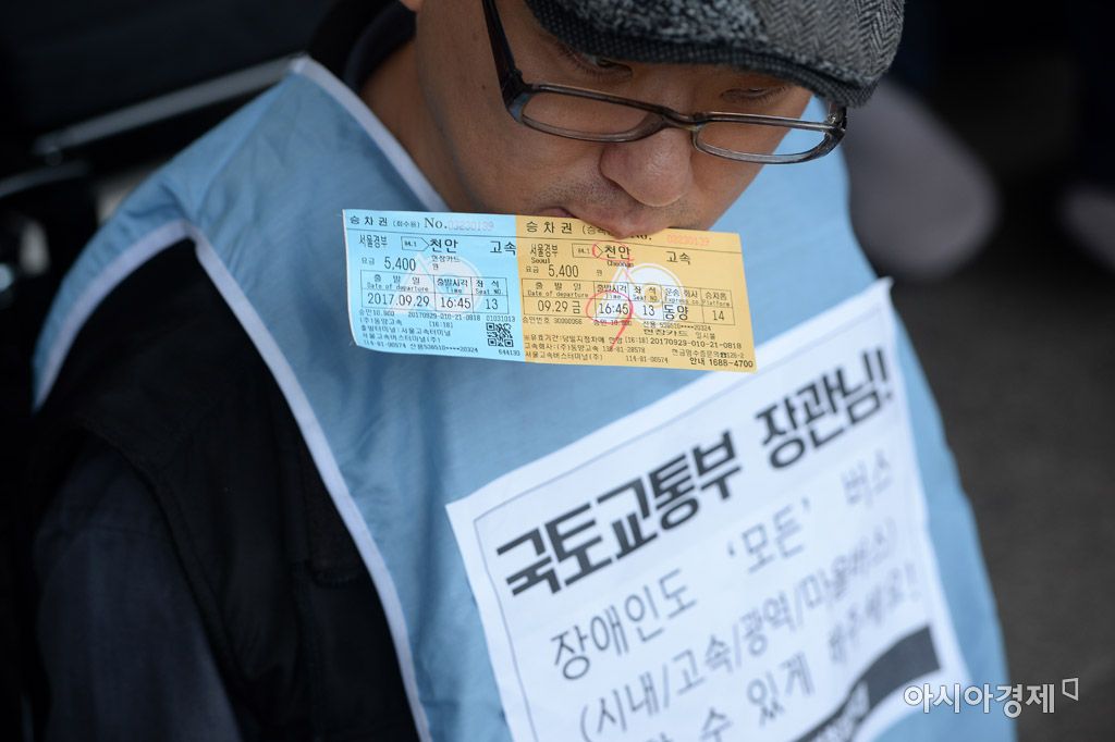 [아시아경제 문호남 기자] 전국장애인차별철폐연대 관계자들이 29일 서울 서초구 서울고속버스터미널에서 '장애인 이동권 보장을 위한 추석연휴 천막농성 돌입 기자회견'을 마친 뒤 김현미 국토교통부 장관과 면담을 촉구하고 있다.문호남 기자 munonam@asiae.co.kr<ⓒ세계를 보는 창 경제를 보는 눈, 아시아경제(www.asiae.co.kr) 무단전재 배포금지>