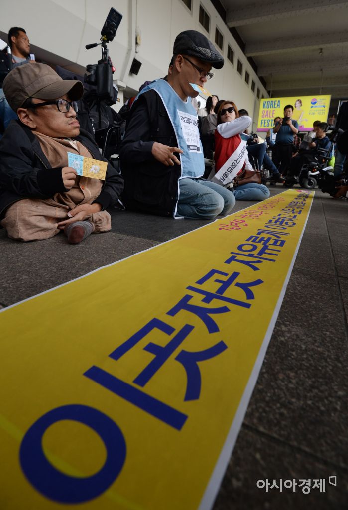 [아시아경제 문호남 기자] 전국장애인차별철폐연대 관계자들이 29일 서울 서초구 서울고속버스터미널에서 '장애인 이동권 보장을 위한 추석연휴 천막농성 돌입 기자회견'을 마친 뒤 김현미 국토교통부 장관과 면담을 촉구하고 있다.문호남 기자 munonam@asiae.co.kr<ⓒ세계를 보는 창 경제를 보는 눈, 아시아경제(www.asiae.co.kr) 무단전재 배포금지>