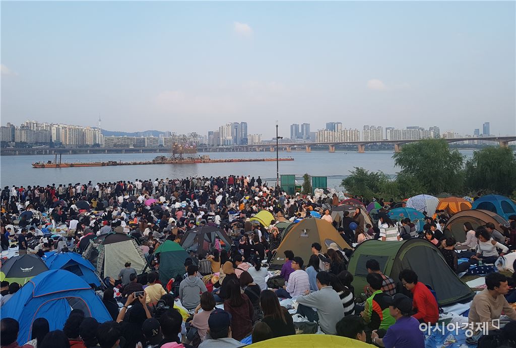 [아시아경제 김민영 기자]최장 10일 간의 ‘황금연휴’ 첫날인 30일 오후 ‘2017 서울세계불꽃축제’를 보기 위해 100만 시민(경찰 추산)이 서울 영등포구 여의도한강공원 일대에 몰렸다.불꽃축제는 오후 7시 20분부터 시작하지만 한강공원 일대는 이미 이날 오후부터 시민들로 꽉 들어찼다. 공원 잔디와 평평한 곳이면 어디든 자리를 깐 시민들로 오후 5시가 지나자 빈자리를 찾기 힘들 정도였다. 경기 수원에서 온 김모(22)씨는 “불꽃축제 보러 처음 왔는데 이렇게 사람들이 많을 줄 몰랐다”고 말했다.30일 오후 서울 지하철 5호선 여의나루역이 '2017 서울세계불꽃축제'를 보러온 시민들로 장사진을 이루고 있다. 사진=김민영