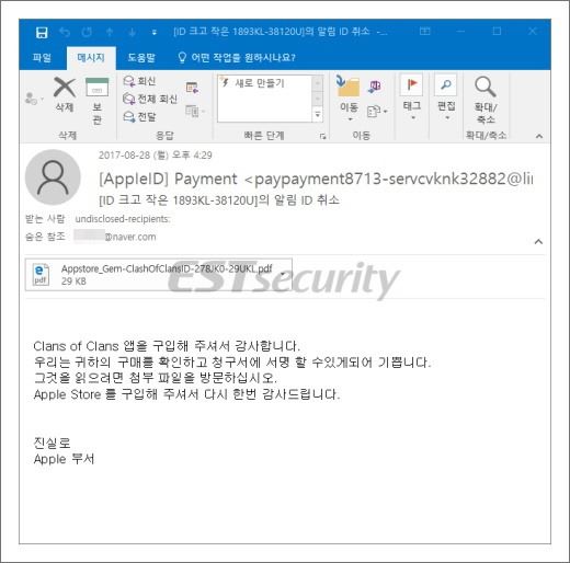 [아시아경제 한진주 기자] '클래시 오브 클랜' 게임 앱 청구서로 위장한 피싱 메일이 유포되고 있다.2일 이스트시큐리티에 따르면 국내 이용자를 대상으로 유포된 이 피싱메일에는 애플 앱스토어에서 앱 청구서를 확인하라는 내용이 포함돼있다. 피싱이란 신뢰할 만한 출처로 위장해서 개인정보나 금융정보를 탈취하기 위해 이메일을 보내는 것을 말한다. 메일에는 청구서로 위장한 PDF 파일이 첨부돼있다. 앱스토어에서 클래시 오브 클랜이라는 게임을 구매한 청구서로 꾸며져있지만, 파일 속 링크를 통해 이용자가 피싱 사이트에 접속하도록 유도하고 있다.청구서 내 링크를 누르면 애플 홈페이지로 위장한 사이트로 연결된다.(출처=이스트시큐리티)