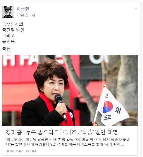 정미홍 전 KBS 아나운서가 김정숙 여사를 향해 맹비난해 논란을 일으키고 있다. 이런 가운데 정미홍 전아나운서를 향한 가수 이승환의 디스가 눈길을 끈다.이승환은 최근 진행된 네이버 V라이브에서 임헌일 밴드를 집중 마크하며 대중에게 널리 소개했다.당시 이승환은 임헌일에게 “하트가 50만개가 넘으면 운동을 해서 1년 후에 공연장에서 상의탈의를 해라”고 공약을 제안했다.이에 임헌일은 “50만개가 어느 정도인지 가늠이 안 간다. 60만개로 하면 안 되냐”는 등 혼란스러워 했다. 그러자 이승환은 “오늘 전 아나운서 한 분이 왔다갔다 하셔서 저도 그림책에 한 소리 했다”고 이야기해 눈길을 끌었다.앞서 이승환은 자신의 페이스북에 “탄핵 인용되면 목숨 내놓겠다”고 발언한 정미홍 전 아나운서에 “극우인사의 극단적 발언 그리고 급번복. 극혐”이라는 글을 게재한 바 있다.이승환의 디스에 네티즌들은 “통쾌하다” “사이다” “센스 있는 디스” 등 다양한 반응을 보였다.한편 정미홍 전 아나운서는 지난 1일 자신의 페이스북을 통해 김정숙 여사에 맹비난을 가했다.김정숙 여사에게 원색적인 비난을 한 정미홍 전 아나운서를 둘러싼 네티즌들의 설전이 이어지고 있는 상황이다.미디어이슈팀 기자 <ⓒ세계를 보는 창 경제를 보는 눈, 아시아경제(www.asiae.co.kr) 무단전재 배포금지>