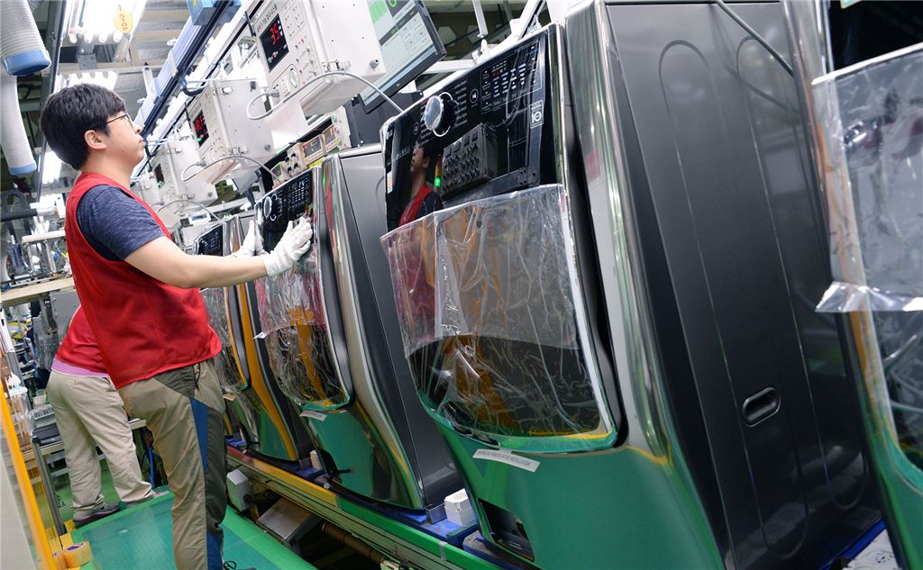 LG전자 직원이 31일 창원2공장에서 제조된 드럼세탁기를 검사하고 있다.