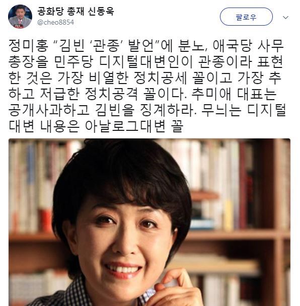 공화당 신동욱 총재가 정미홍 더코칭그룹 대표와 김빈 더불어민주당 디지털대변인과의 설전에 대해 일침했다.신 총재는 7일 자신의 트위터에 "정미홍 “김빈 ‘관종’ 발언”에 분노, 애국당 사무총장을 민주당 디지털대변인이 관종이라 표현한 것은 가장 비열한 정치공세 꼴이고 가장 추하고 저급한 정치공격 꼴이다. 추미애 대표는 공개사과하고 김빈을 징계하라. 무늬는 디지털대변 내용은 아날로그대변 꼴"이라는 글을 게재해 정미홍 대표를 옹호했다.앞서 정미홍 대표는 지난 1일 영부인 김정숙 여사를 향해 "김정숙 여사가 대통령 전용기에 반입 금지된 나무, 음식물 을 실어 날라 국가 망신을 시키고 있다"며 "권력을 쥐면 법은 안 지켜도 되는 줄 아냐"고 비판했다.이를 접한 김빈 대변인은 지난 3일 자신의 트위터에 "정미홍 님, 관심종자라는 말을 아십니까?"라며 "국민들은 그분을 김정숙 여사님이라 부릅니다. 한편 국민은 당신을 관종이라 부릅니다"라며 정미홍 대표를 비난했다.이에 지지 않고 정미홍 대표는 지난 6일 자신의 페이스북에 "김빈이 누구죠? 더불어민주당 무슨 대변인이라는데 듣도 보도 못한 어린 사람이 나와서 저를 관종이라 했답니다"라는 글을 게재하며 반격했다.미디어이슈팀 기자 <ⓒ세계를 보는 창 경제를 보는 눈, 아시아경제(www.asiae.co.kr) 무단전재 배포금지>