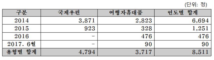 2014년~2017년(6월) 인육캡슐 밀반입 유형 및 적발현황 자료. 박명재 의원실 제공