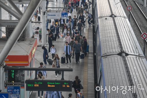 [아시아경제 강진형 기자]추석 연휴 막바지인 8일 오전 서울역에서 귀경객들이 기차에 내려 이동하고 있다.강진형 기자 aymsdream@asiae.co.kr<ⓒ세계를 보는 창 경제를 보는 눈, 아시아경제(www.asiae.co.kr) 무단전재 배포금지>