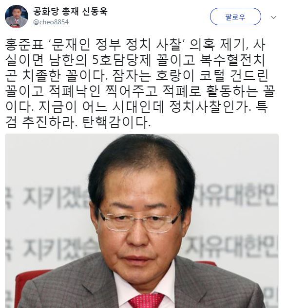 자유한국당 홍준표 대표가 오늘(9일) 여권의 '정치사찰 의혹'을 제기해 이에 공화당 신동욱 총재가 일침을 가했다.홍 대표는 이날 서울 여의도 당사에서 열린 최고위원회의에서 문재인 정부 출범 직후 국가정보원과 검찰, 경찰 등 수사당국이 개인 통신자료 100만건을 수집한 것과 관련해 수행비서의 전화가 통신조회된 사실을 공개하며 '정치사찰'이라고 비판했다.이에 신 총재는 자신의 트위터에 "홍준표 ‘문재인 정부 정치 사찰’ 의혹 제기, 사실이면 남한의 5호담당제 꼴이고 복수혈전치곤 치졸한 꼴이다. 잠자는 호랑이 코털 건드린 꼴이고 적폐낙인 찍어주고 적폐로 활동하는 꼴이다. 지금이 어느 시대인데 정치사찰인가. 특검 추진하라. 탄핵감이다"는 글을 게재했다.한편 이날 홍 대표는 이명박 정부 국가정보원의 불법적인 행태가 연일 드러나고 있는 상황과 관련 “정치보복대책특위를 만들어서 이 정부가 하고 있는 정치보복에 대해 적극적으로 나설 것”이라고 밝혔다.미디어이슈팀 기자 <ⓒ세계를 보는 창 경제를 보는 눈, 아시아경제(www.asiae.co.kr) 무단전재 배포금지>