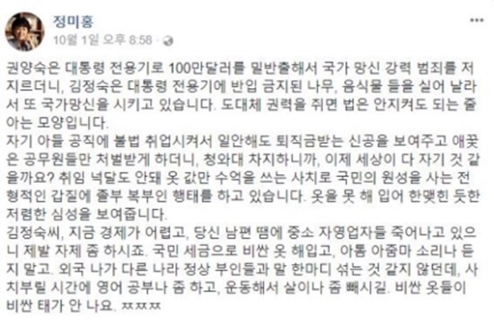 정미홍 더코칭그룹 대표가 청와대 김정숙 여사를 비난해 화제가 된 가운데 그의 원색적인 발언이 질타를 받고 있다.정미홍 대표는 지난 1일 자신의 SNS를 통해 김정숙 여사가 지난 7월 대통령 전용기에 통영산 동백나무를 실어 베를린 외곽 윤이상 선생 묘소에 심은 것을 두고 “국가 망신을 시키고 있다. 도대체 권력을 쥐면 법을 안 지켜도 되는 줄 아는 모양”이라고 비난했다.이어 정미홍 대표는 김정숙 여사 아들의 불법 취업 특혜 의혹과 김정숙 여사의 의상 관련 비용 지출 등을 지적하며 “국민의 원성을 사는 전형적인 갑질에 졸부 복부인 행태를 하고 있다. 옷을 못 해 입어 한 맺힌 듯한 저렴한 심성을 보여 준다”고 덧붙였다.그러면서 정미홍 대표는 “김정숙 씨, 지금 경제가 어렵고 당신 남편(문재인 대통령) 때문에 중소 자영업자들 죽어나고 있으니 제발 자제 좀 하시라”며 “국민 세금으로 비싼 옷 해 입고, 아톰 아줌마 소리나 듣지 말고. 외국 나가 다른 나라 정상 부인들과 말 한마디 섞는 것 같지 않던데, 사치부릴 시간에 영어 공부나 좀 하고, 운동해서 살이나 좀 빼시길. 비싼 옷들이 비싼 태가 안 난다”고 원색적인 비난을 이어갔다.그러나 청와대는 9일 페이스북을 통해 “10여년 된 옷 입고 수선도 합니다”라고 김정숙 여사의 패션에 대해 해명했으며 누리꾼들 역시 정미홍 대표의 글에 대해 질타를 하고 나섰다.가장 문제가 되고 있는 것은 사실여부를 떠난 원색적인 비난과 인신공격 등이다. “왜 옷가지고 그러냐”, “인신공격은 너무했다” 등 정미홍 대표의 해당 글은 여전히 온라인을 뜨겁게 달구며 누리꾼들 사이에서 논란이 되고 있다.미디어이슈팀 기자 <ⓒ세계를 보는 창 경제를 보는 눈, 아시아경제(www.asiae.co.kr) 무단전재 배포금지>