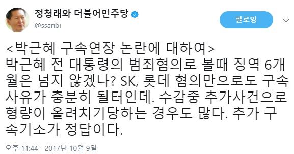 10일 정청래 전 더불어민주당 의원이 박근혜 전 대통령에 대한 추가 구속 기소가 필요하다고 주장했다. /사진=정청래 전 의원 트위터